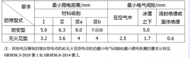 2. 增安型和無火花型電機都對電氣間隙和爬電距離有要求,但在相同電壓等級下,增安型電動機帶電部件間的zui小電氣間隙和zui小爬電距離要求比無火花型電動機的大(詳見表 1),並且無火花電機使用的絕緣部件的材料級別可低至 Ⅲb 級,而增安型電機需使用 Ⅲa 及以上級別的。