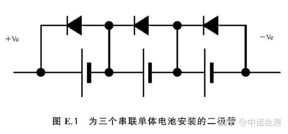 ——使用旁路二極管限製每個單體電池極性接反時的電壓。例如,對於由三個單體電池串聯連接組成的電池組提供的保護電路如圖E.1所示。