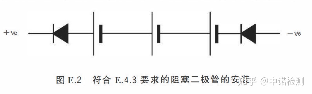 ——采用GB/T 3836.3 規定的電氣間隙和爬電距離僅將電池和其他電源隔離,但是安裝有如圖E.2 所示的阻塞二極管,可降低由兩個二極管短路引起的單個故障危險 。